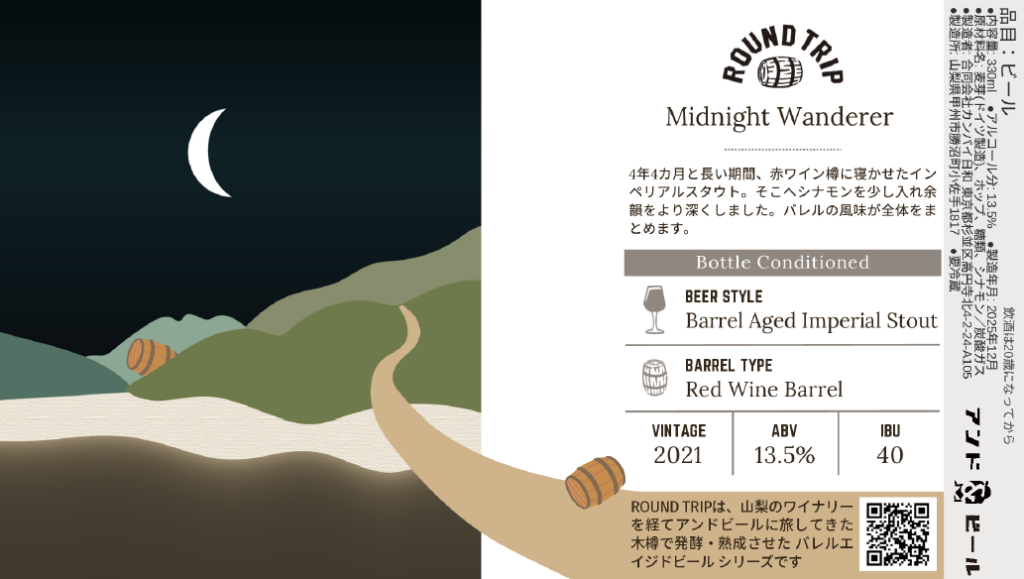 アンドビールのバレルエイジドシリーズ”ROUND TRIP”第7弾となるビールは、2021年から4年3か月もの間、赤ワインバレルに入れたインペリアルスタウトです。