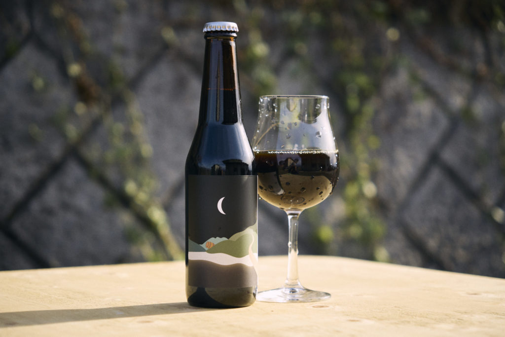 今回のボトルのイラストもトモエ画伯 @tomo.crafts によるもの。山の稜線は、アンドビール勝沼工場から、高円寺方面(東側)を向いた時の山の景色、月はビールをワイン樽に詰めた日の月の形を描いています。